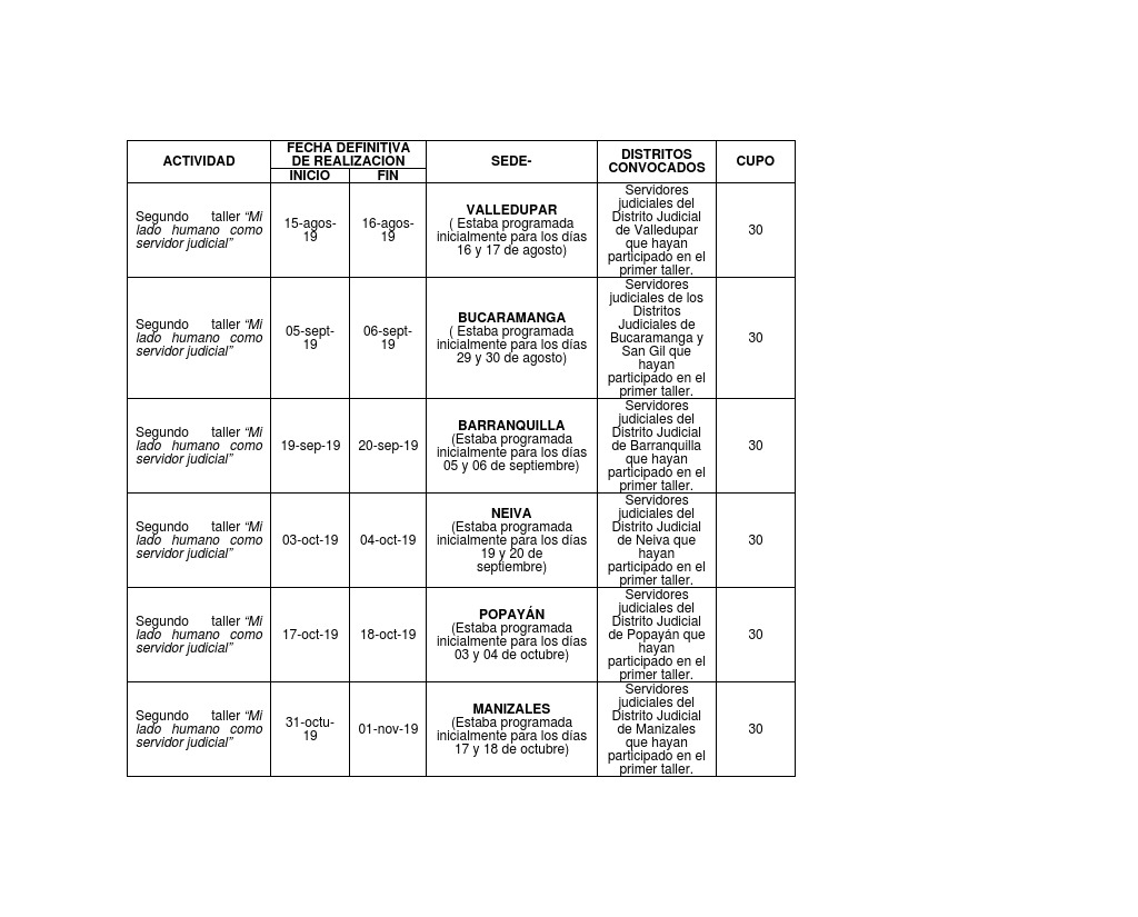 REPROGRAMACIÓN DE ALGUNAS ACTIVIDADES ADELANTADAS CON OCASIÓN DEL PROYECTO “MI LADO HUMANO COMO SERVIDOR JUDICIAL”, PARA EL SEGNDO SEMESTRE DE LA VIGENCIA 2019.