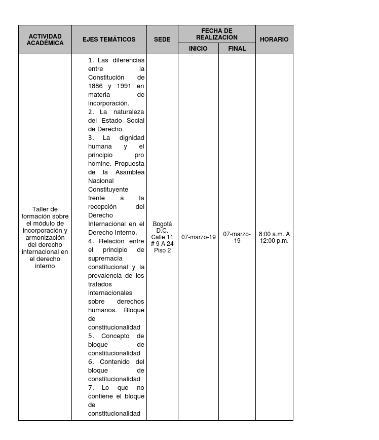 La Escuela Judicial “Rodrigo Lara Bonilla” convoca a los Magistrados, Jueces y Empleados de todas las especialidades de los Distritos Judiciales de Bogotá D.C. y Cundinamarca, para que participen en el “Taller de formación sobre el módulo de incorporación y armonización del derecho internacional en el derecho interno”, el cual tendrá lugar en la siguiente fecha: