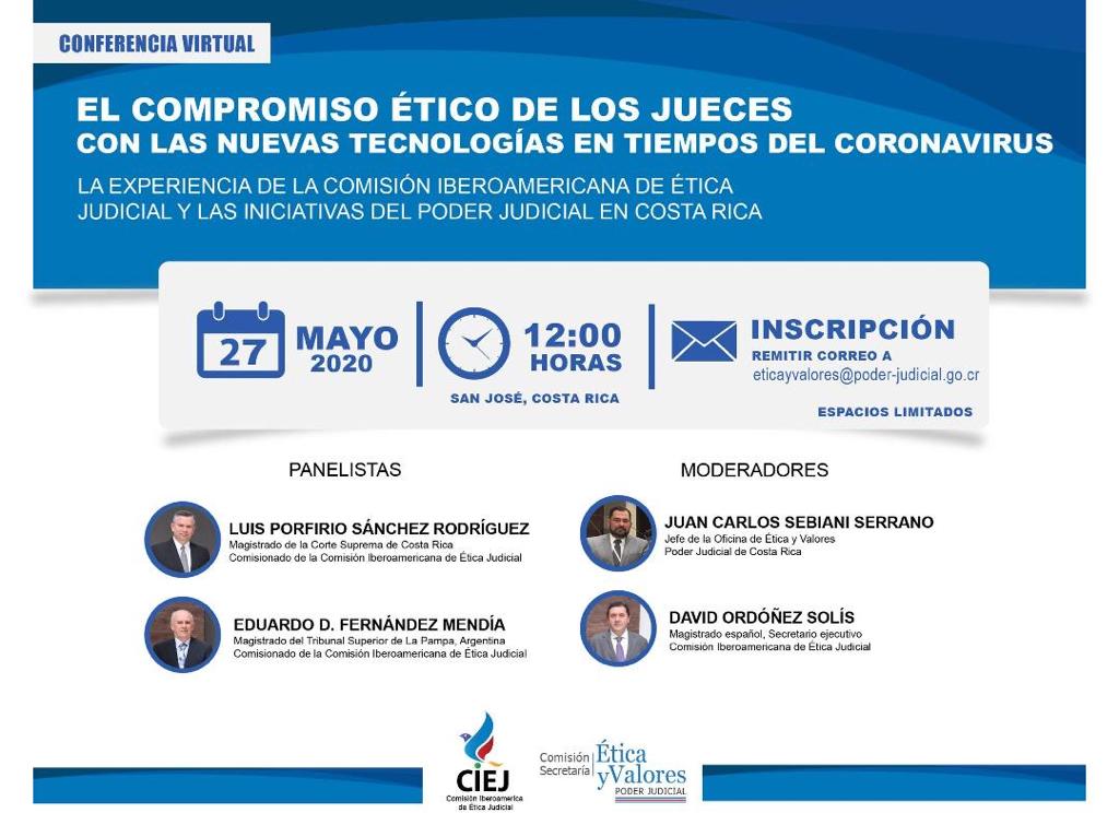 La Escuela Judicial "Rodrigo Lara Bonilla" informa que la actividad académica se realizará el 27 de mayo de 2020, por parte de la Comisión Iberoamericana de Ética Judicial, a las 12:00 (hora costarricense)
