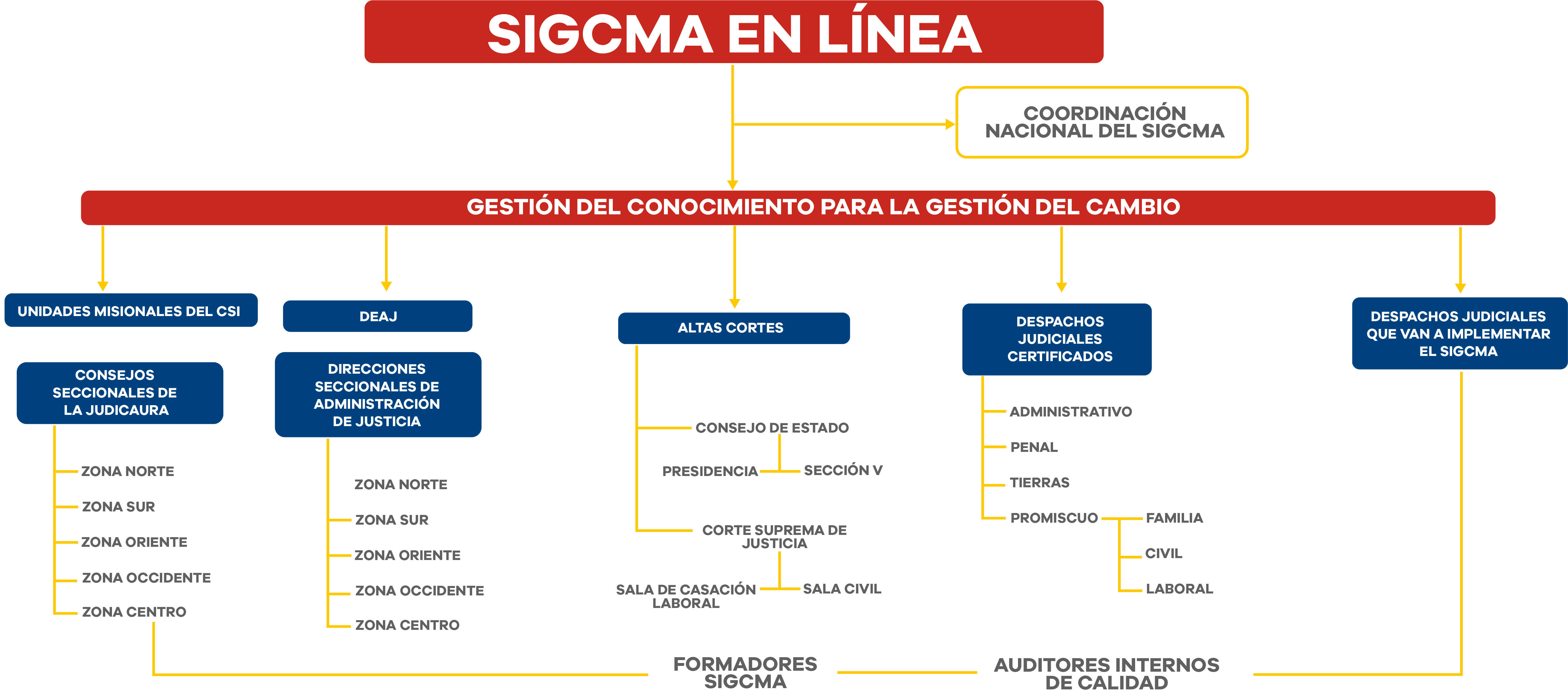 SIGCMA EN LÍNEA se constituye en una estrategia virtual indispensable y permanente cuyo objetivo es Formar y capacitar a los empleados (as) y funcionarios (as) judiciales en Sistemas de Gestión de Calidad con el fin de lograr el mantenimiento, mejora continua, consolidación del Sistema Integrado de Gestión y Control de la Calidad y el Medio Ambiente y generación y gestión del conocimiento para la consolidación de las Buenas Prácticas en la Rama Judicial y de manera especial en el Sistema Penal Acusatorio que viene trabajando de manera decidida en el mantenimiento del Sistema.